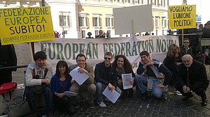 On the occasion of the Merkel-Monti summit in Rome on the 13th of March, MFE organized a manifestation in front of the Italian Parliament asking for a “European Federation Now!” The federalist demonstration was joined by the Vice-President of the European Parliament, Gianni Pittella, by MEPs Debora Serracchiani and Roberto Gualtieri, by Italian MPs Lapo Pistelli, Roberto Di Giovan Paolo and Sandro Gozi, and by several representatives of organizations from civil society and political foundation from the right to the left side.