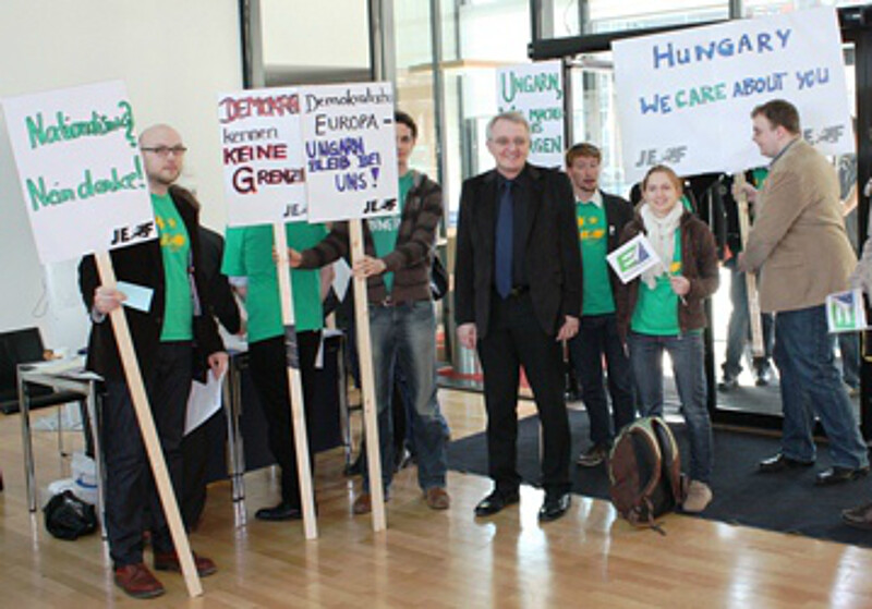 On March 24, the Joint Federal Committee of the EUD and JEF met in Berlin. Before their meeting, the Delegates of Europa-Union and Young European Federalists demonstrated for democracy and the rule of law in front of the Hungarian Embassy.